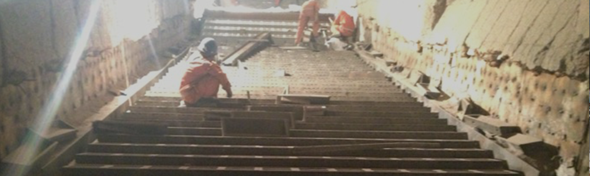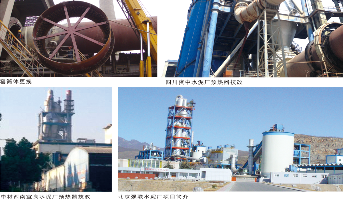 我公司每年為十幾個水泥廠提供大修改造服務,主要內(nèi)容有∶ 窯系統(tǒng)換民,預熱器更換澆筑料窯托輪更換軸承瓦,更換窯口鐵,更換筒體; 磨機更換襯板,銅壓機更換銀套,立磨更換襯板及輾套; 破碎機更換襯板及錘頭,堆取料機更換鏈條及刮板; 全廠電機檢查,其他附機設備檢修; 其他甲方要求的項目。